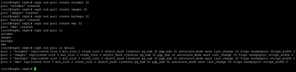 [root@ceph1 ceph]# ceph osd pool create volumes 32