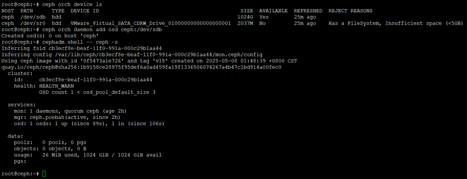 root@ceph:~# ceph orch daemon add osd ceph:/dev/sdb