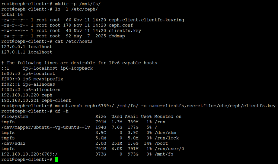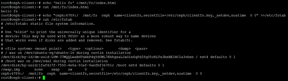 root@ceph-client:~# echo "ceph:6789:/ /mnt/fs ceph name=clientfs,secretfile=/etc/ceph/clientfs.key,_netdev,noatime 0 0" >>/etc/fstab