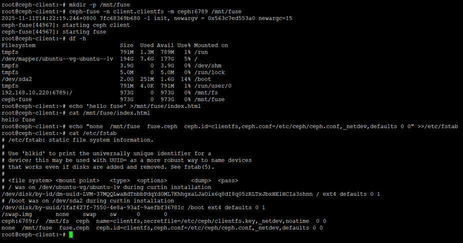 root@ceph-client:~# echo "none /mnt/fuse fuse.ceph ceph.id=clientfs,ceph.conf=/etc/ceph/ceph.conf,_netdev,defaults 0 0" >>/etc/fstab