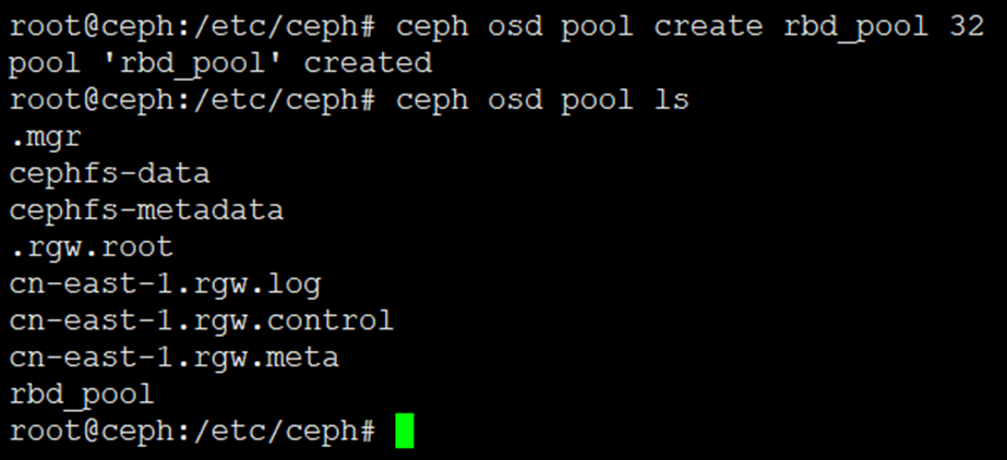 root@ceph:/etc/ceph# ceph osd pool create rbd_pool 32