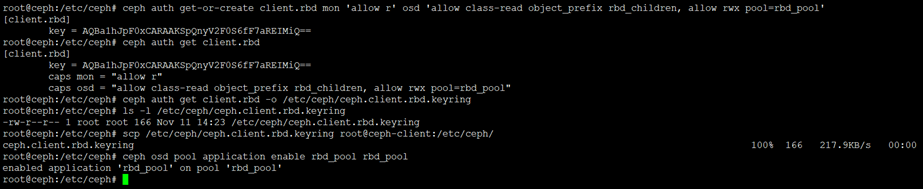 root@ceph:/etc/ceph# scp /etc/ceph/ceph.client.rbd.keyring root@ceph-client:/etc/ceph/