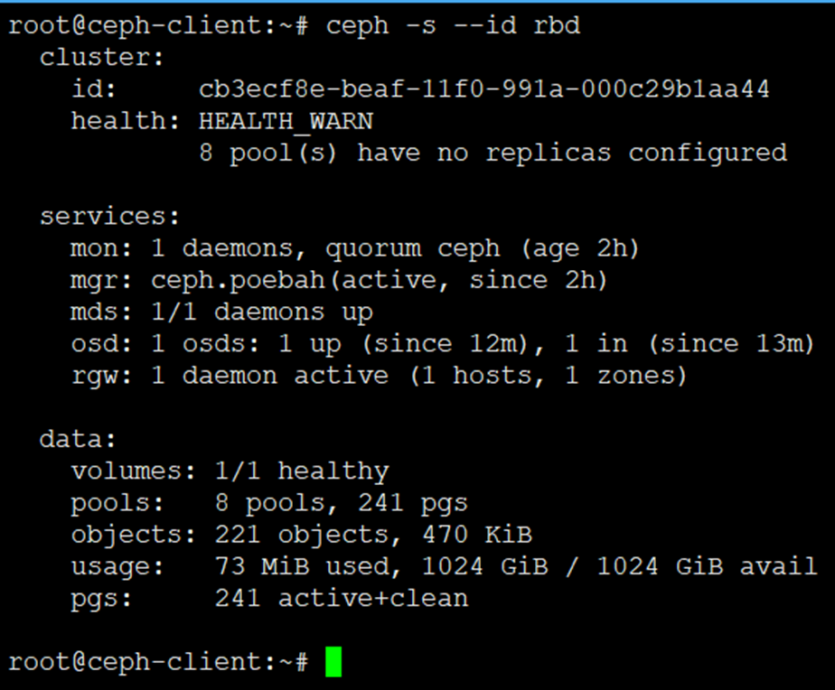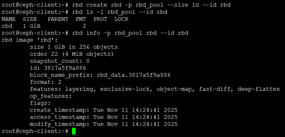 root@ceph-client:~# rbd create rbd -p rbd_pool --size 1G --id rbd