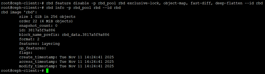 root@ceph-client:~# rbd feature disable -p rbd_pool rbd exclusive-lock, object-map, fast-diff, deep-flatten --id rbd