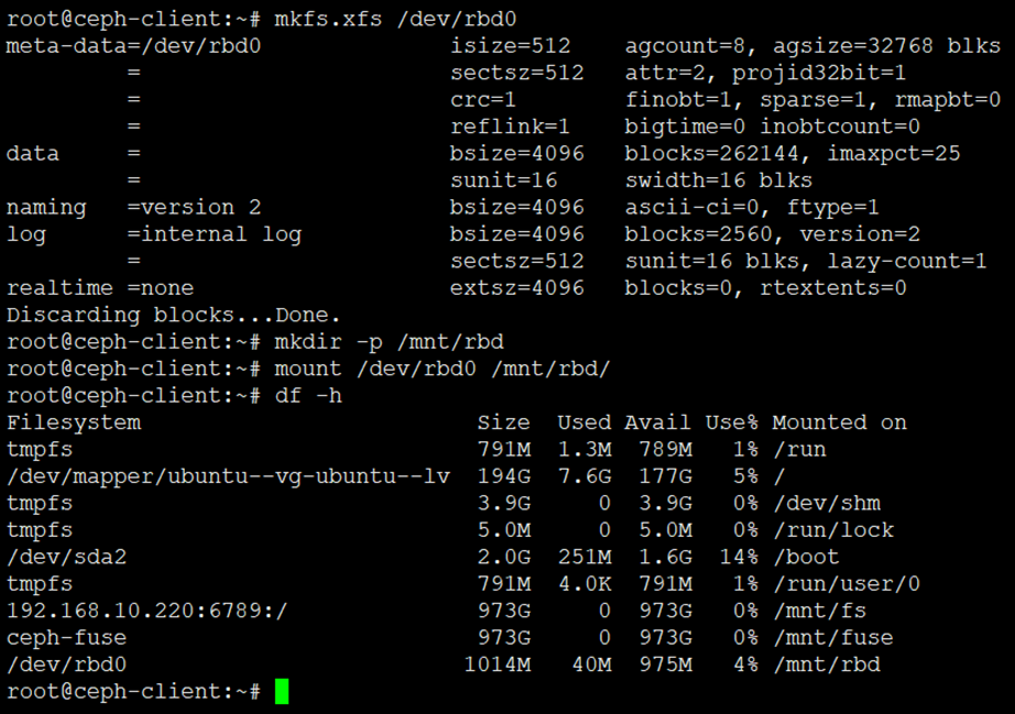 root@ceph-client:~# echo "/dev/rbd0 /mnt/rbd xfs defaults,_netdev 0 0" >>/etc/fstab