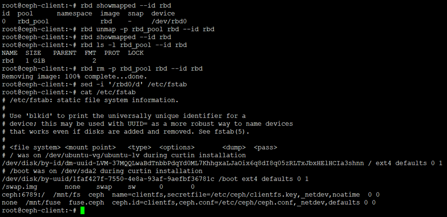 root@ceph-client:~# sed -i '/rbd0/d' /etc/fstab