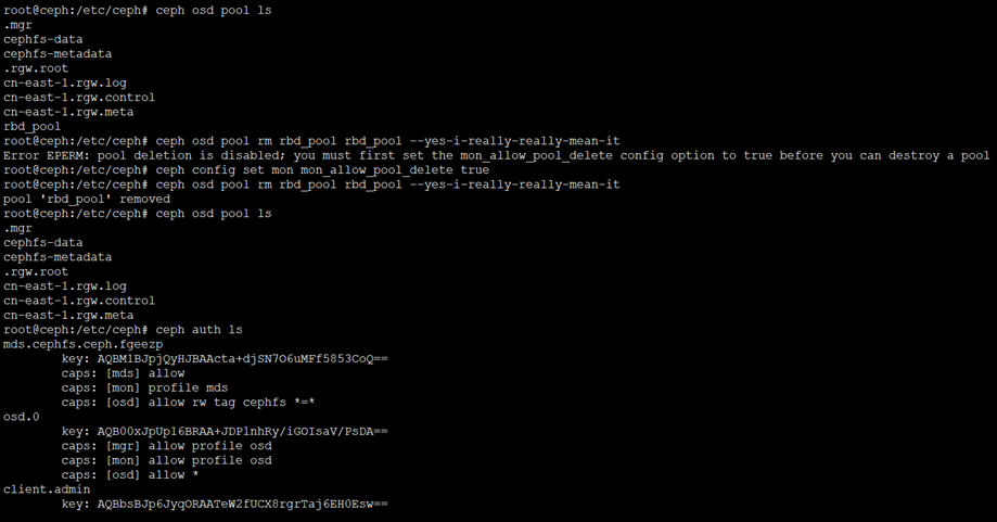 root@ceph:/etc/ceph# ceph osd pool rm rbd_pool rbd_pool --yes-i-really-really-mean-it