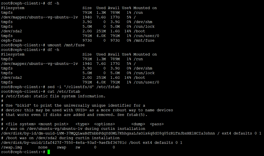 root@ceph-client:~# sed -i '/clientfs/d' /etc/fstab