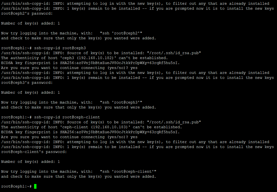 root@ceph1:~# ssh-copy-id root@ceph-client